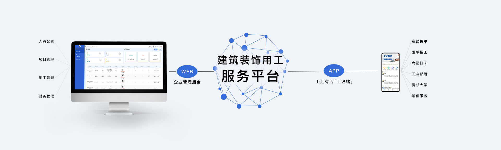 致力于解决建筑装饰行业用工环节:工人素质参差不齐、招工难、用工难、管理难、用工风险大等困扰企业管理者多年,制约企业长久发展的核心问题。